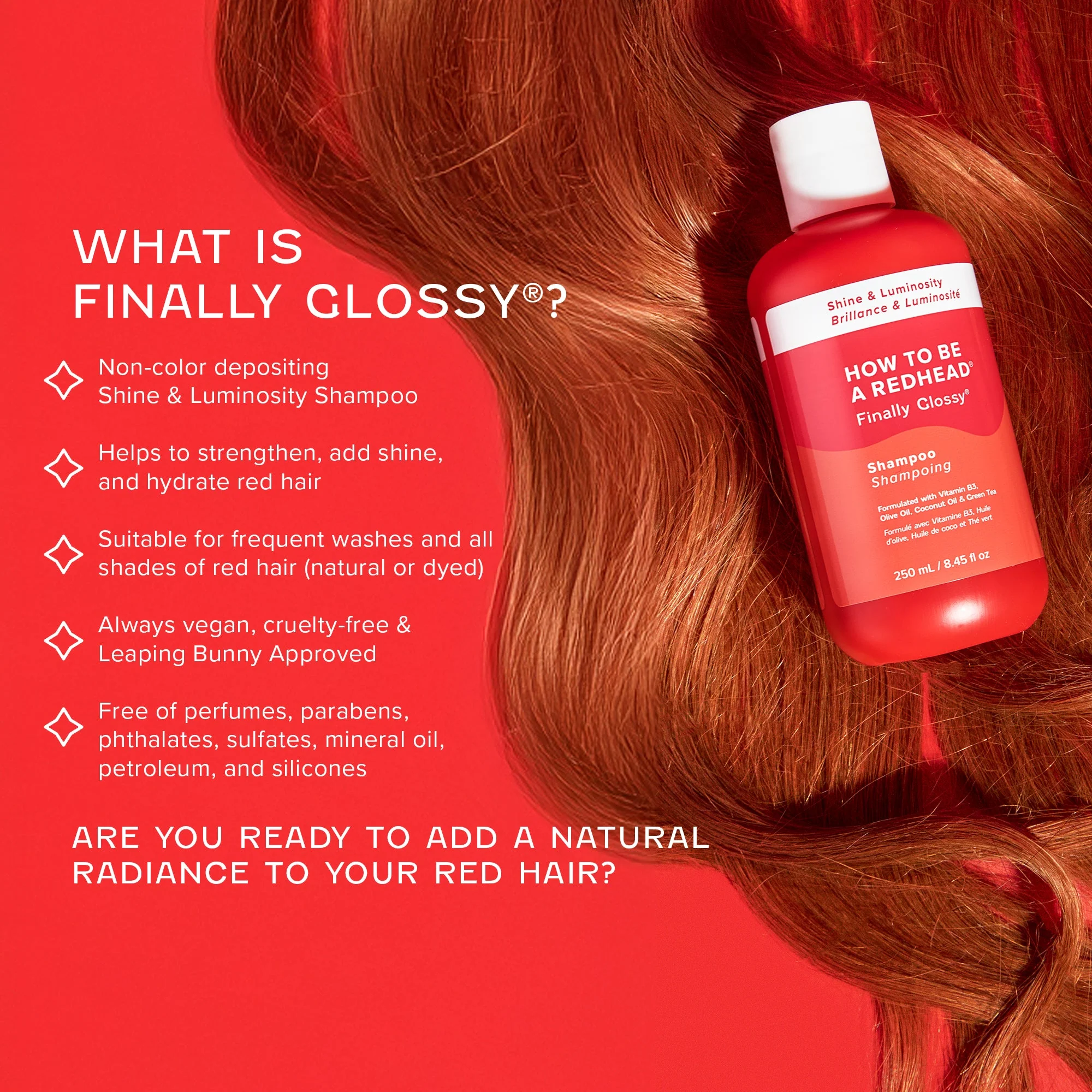 A new and improved larger bottle and updated branding accompany the same fan-favorite formula. Finally Glossy is a special shampoo that helps strengthen, shine, and hydrate red hair. Its formula includes Vitamin B3, olive oil, coconut oil, and green tea.
